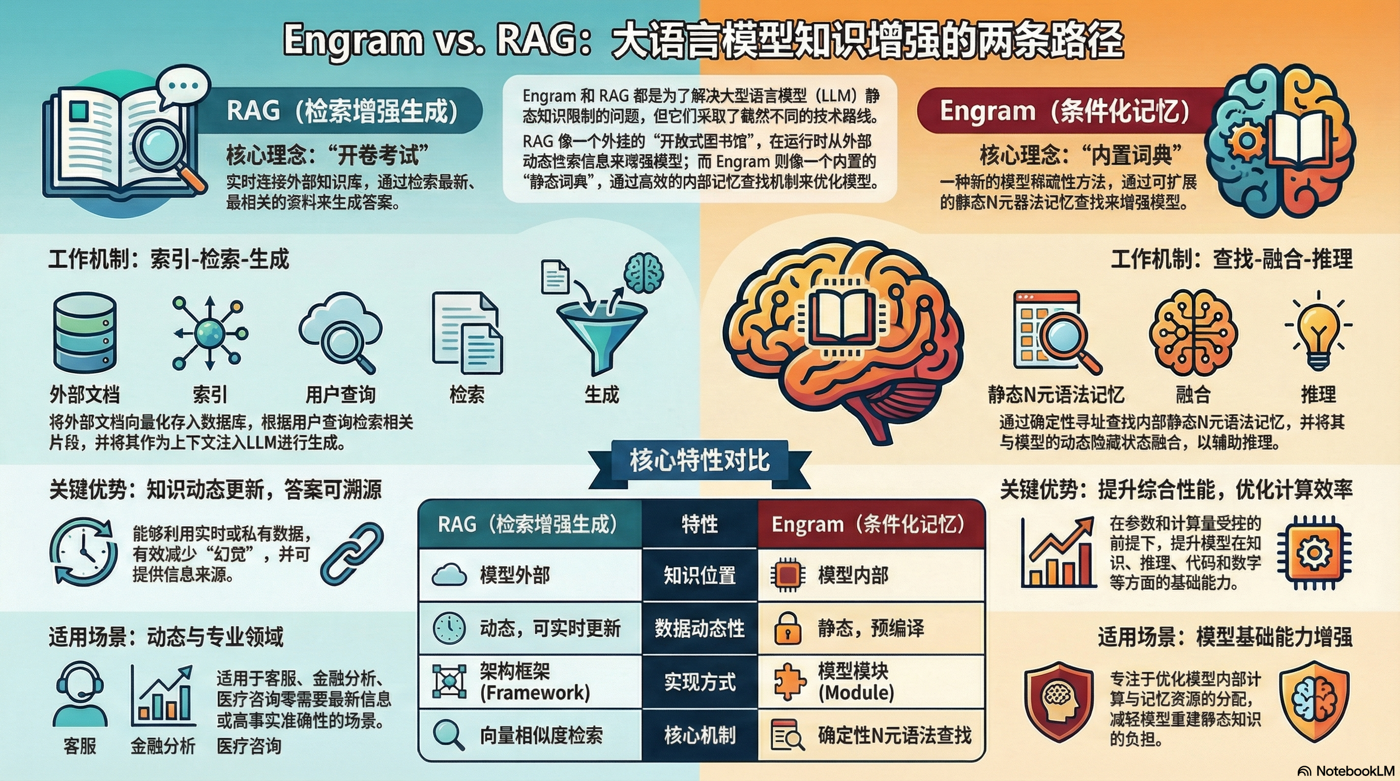 Engram 和 RAG(检索增强生成)虽然都是为了增强大语言模型(LLM)处理知识的能力,但它们在技术层级、实现机制和核心目标上有显著区别。