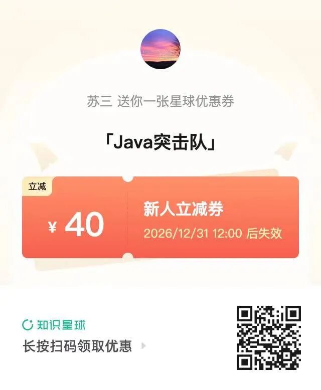 最后欢迎 加入苏三的星球,你将获得:商城微服务系统、商城系统、秒杀系统、代码生成工具、苏三demo系统等项目实战。系统设计、性能优化、技术选型、高频面试题、底层原理、Spring源码解读、工作经验分享、痛点问题等多个优质专栏。