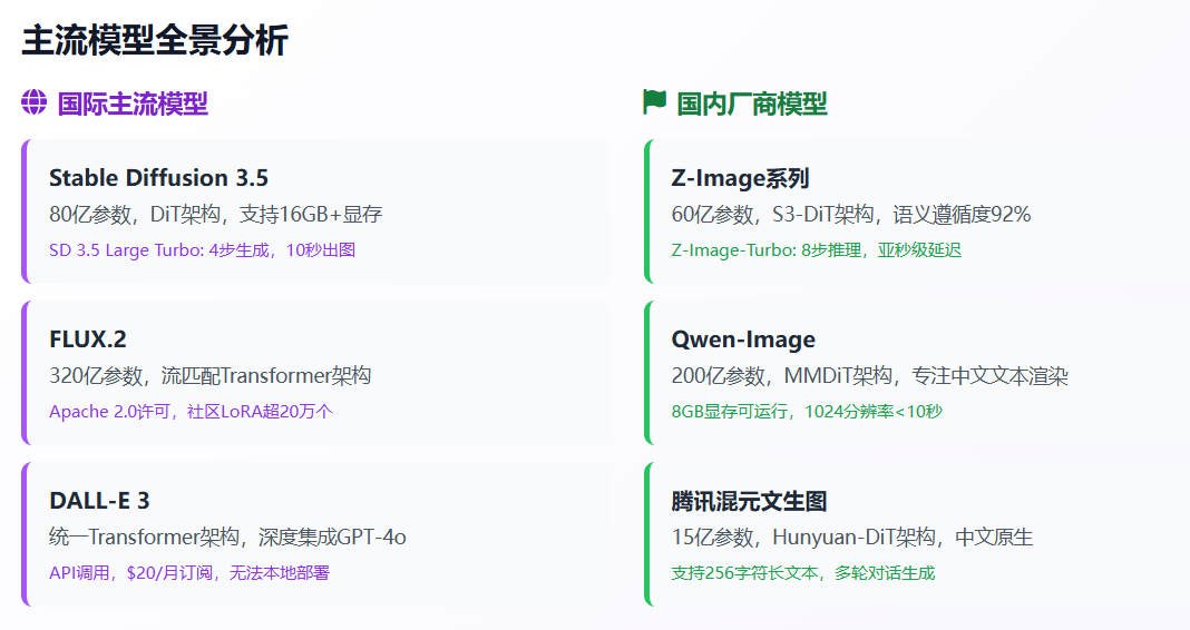 当前文生图模型呈现出开源主导创新的格局,Stable Diffusion 生态系统不断壮大,同时国内厂商也在积极布局,推出了如 Z-Image、Qwen-Image、腾讯混元等具有自主知识产权的模型。这些模型在技术架构、生成效果、硬件要求等方面各有特色,为不同需求的用户提供了丰富的选择。