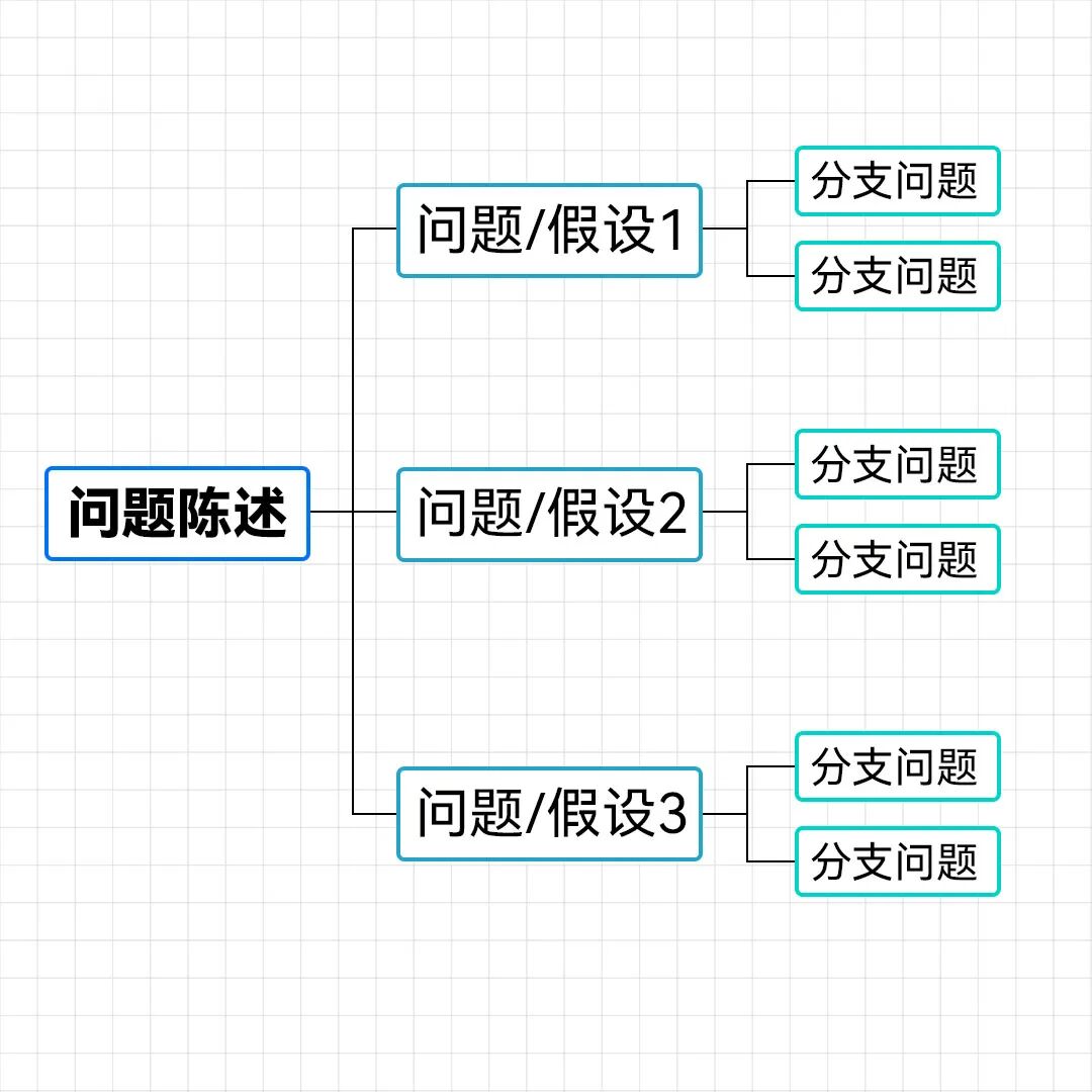 拿到了清楚的问题,接下来要做的,是把问题拆解开。 是的。到了这一步,还是不要去尝试解决问题,不要提出“点子”。 先耐心,把问题拆解到足够细,足够小。 怎么拆? 首先,你可能需要掌握一些“模型”。模型,就是你分析问题,拆分世界的方法。 比如,你可以把商业世界,拆分成“创造价值”的角****色,和“传递价值”的角色;或者,拆分成农业、工业、服务业;又或者,拆分成互联网行业、汽车行业、白酒行业…… 具体选择什么模型,取决于你对业务的理解情况,没有标准答案。 但这,只是第一步。接着,你还需要对问题进一步拆分。这时,注意应用:MECE法则。 MECE法则,是一种思考方式,强调在列举可能性的时候,要相互独立,完全穷尽。也即:不重不漏。 比如,你问我,昨天吃了什么? 我说,我吃了午餐,我喝了汤,我吃了蔬菜,我还吃了不少主食。 停。虽然给出的答案很多,但这有重合,又有错漏,不符合不重不漏的原则。 那该怎么分? 或许,我可以先按照时间分,早饭,午饭,晚饭。接着,再按照食物种类分,其中早饭吃了肉,蛋,蔬菜…… 每一层,都选择固定的标准,做到不重不漏。 像这样,先用模型做横向拆分(从问题陈述到问题1、2、3),再用MECE法则做纵向拆分(从问题1到分支问题),我们就得到了一个问题树。看图。