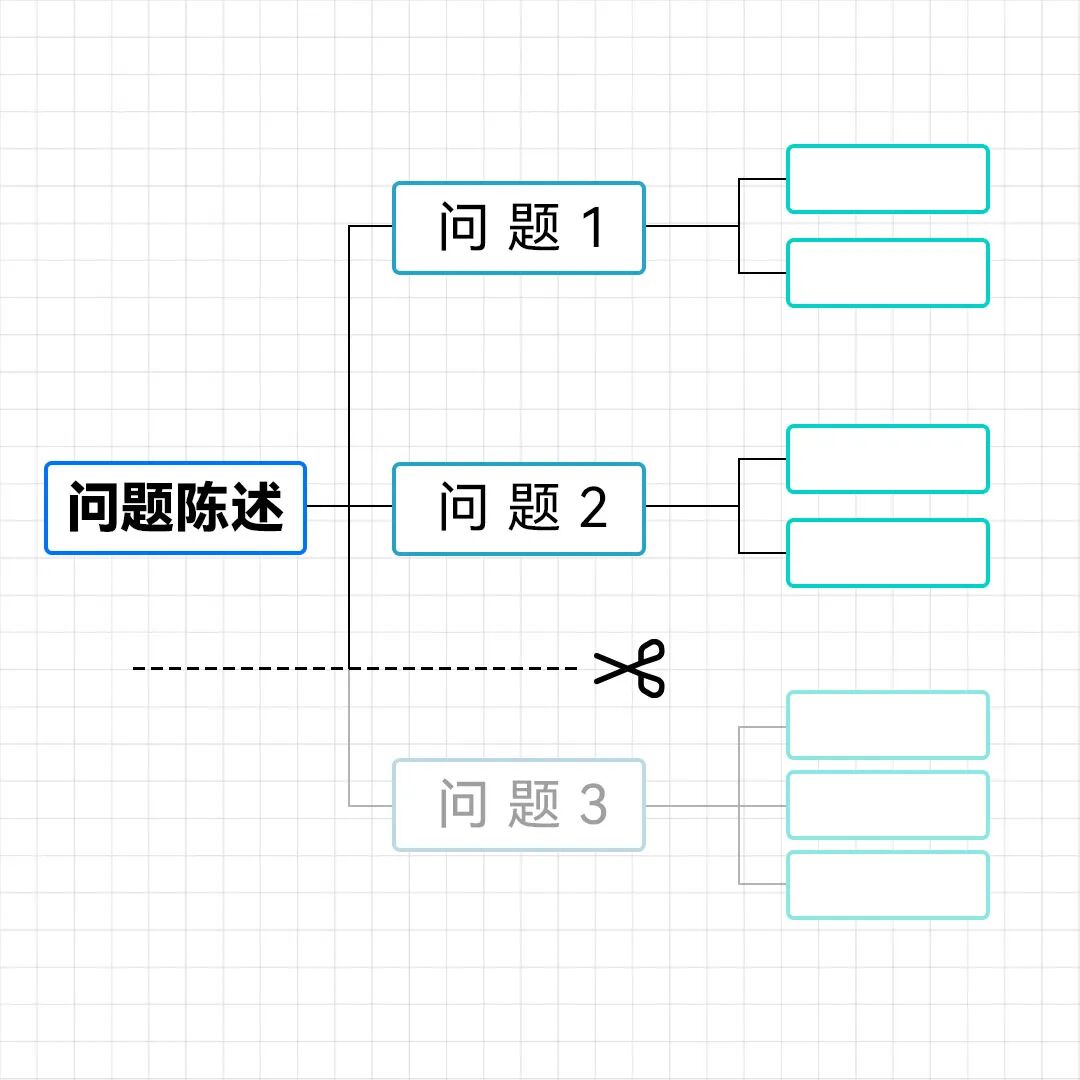 接着,是摆脱“散点思维”的关键一步:删去非关键问题。 人的精力,总是有限的。 把问题树上所有的问题,都处理一遍,显然是不可能的。 如何取舍?把这些问题,按照优先级进行排序,删掉后边的问题,优先解决排在前边的问题。