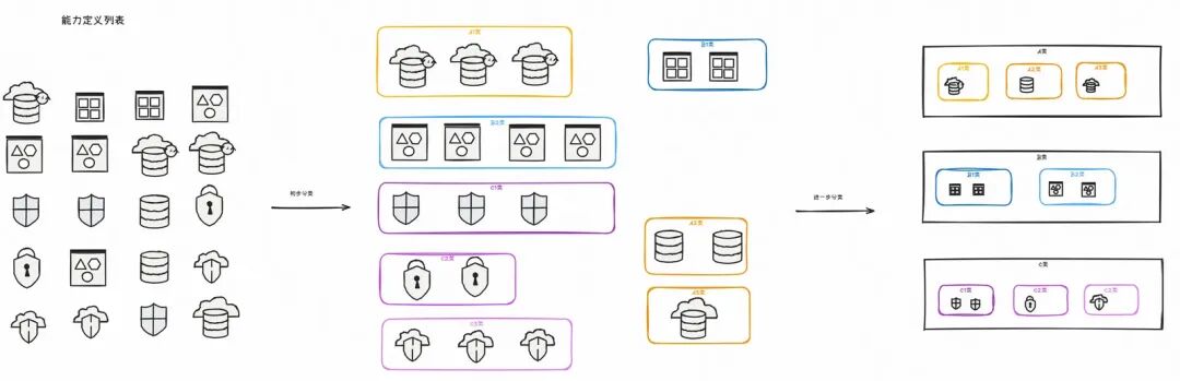 下图使用简单的形状表示不同的能力项,初步分类将业务相同的归为同一类,从20个能力项得到了8个类别。再通过功能分类相同的归为同一类,进一步抽象得到了3类业务功能能力。最终从20个能力项变成了3类业务能力,这就是抽象之美。