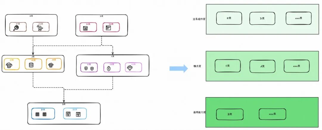 对能力分类后的能力类列表进行类关系明确(左图),再根据类关系将其填入到分层模型中,将会得到一张接近完整的业务模型图。