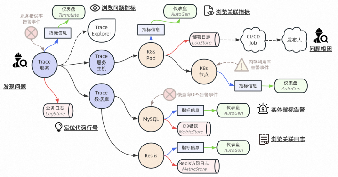 1. 根据 Trace 链路及关联数据定位错慢请求异常对象:链路追踪可以跟踪一次请求在分布式系统中的流转路径与状态,同时将这次请求发生过程中的日志、方法栈、出入参、异常堆栈等数据精准关联,实现异常代码行级定位。比如用户在APP下单超时,通过前后端链路追踪结合方法栈,最终定位到A应用B接口C方法耗时超过3s,影响了终端客户体验。 2. 根据异常对象关联的实体数据分析真实根因:代码执行报错或缓慢只是问题表象,导致变化发生的原因可能是一次未经灰度验证的应用发布,或是底层基础设施故障,亦或是业务流量突增导致共享资源不足。这些信息与异常对象存在着直接或间接的关联关系,需要构建更广泛的跨域实体关联才能完成深层次定位。比如A应用正常访问数据库B突然出现许多慢SQL,通过数据库客户端与服务端实体关联,就能快速定位到数据库服务端连接池打满(受到C应用大查询影响)。 3. 高质量数据+领域知识+大模型算法实现智能根因诊断:线上系统的复杂性,决定了根因诊断会涉及海量实体的多模态数据综合分析,对于数据丰富度、质量、排查经验与时效性均有极高的要求。构建统一可观测平台实现端到端全栈数据采集,遵循一套语义构建统一实体关系模型,再结合LLM大模型编排与领域知识库,最终实现面向错慢诊断等经典运维场景的自动化归因。