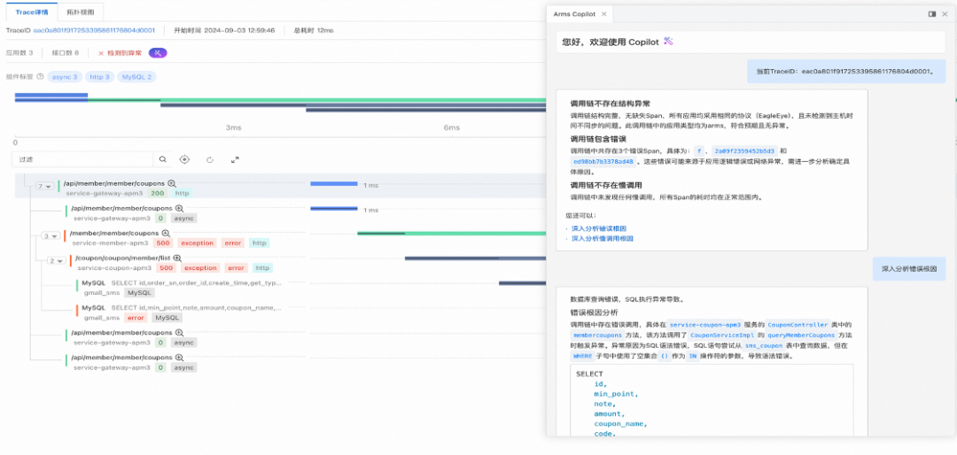 如下图所示,该次请求报错的根因是 service-coupon-apm3 应用 /coupon/coupon/member/list 接口内部的 queryMemberCoupons 方法执行了数据库查询,该 SQL 的 WHERE 子句使用了空集合()作为IN操作符,最终导致语法报错。