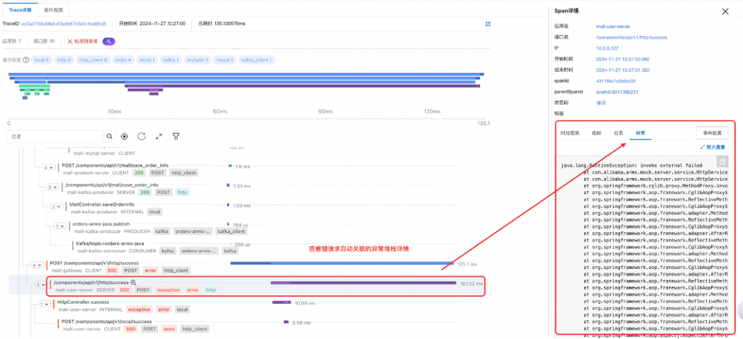 2. 链路关联异常堆栈:以 Java 应用为例,系统报错通常会抛出特定异常(包含详细的错误原因与调用堆栈),通过 TraceId 准确关联当次请求的异常堆栈,可以加速研发排障效率。