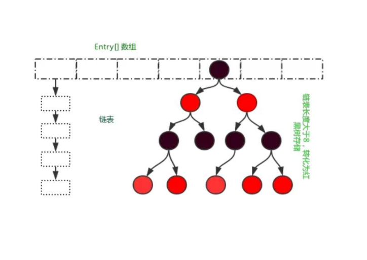 - 数据结构:在 JDK 1.7 版本之前, HashMap 数据结构是数组和链表,HashMap通过哈希算法将元素的键(Key)映射到数组中的槽位(Bucket)。如果多个键映射到同一个槽位,它们会以链表的形式存储在同一个槽位上,因为链表的查询时间是O(n),所以冲突很严重,一个索引上的链表非常长,效率就很低了,所以在 JDK 1.8版本的时候做了优化,当一个链表的长度超过8的时候就转换数据结构,不再使用链表存储,而是使用红黑树,查找时使用红黑树,时间复杂度O(log n),可以提高查询性能,但是在数量较少时,即数量小于6时,会将红黑树转换回链表。