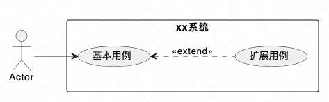 actor Actorrectangle "xx系统" { usecase "基本用例" as UC1 usecase "扩展用例" as UC2}