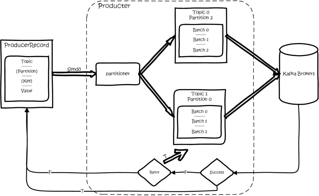 kafka sdk product flow.png 创建一条记录,记录中一个要指定对应的topic和value,key和partition可选。先序列化,然后按照topic和partition,放进对应的发送队列中。kafka produce都是批量请求,会积攒一批,然后一起发送,不是调send()就进行立刻进行网络发包。如果partition没填,那么情况会是这样的: