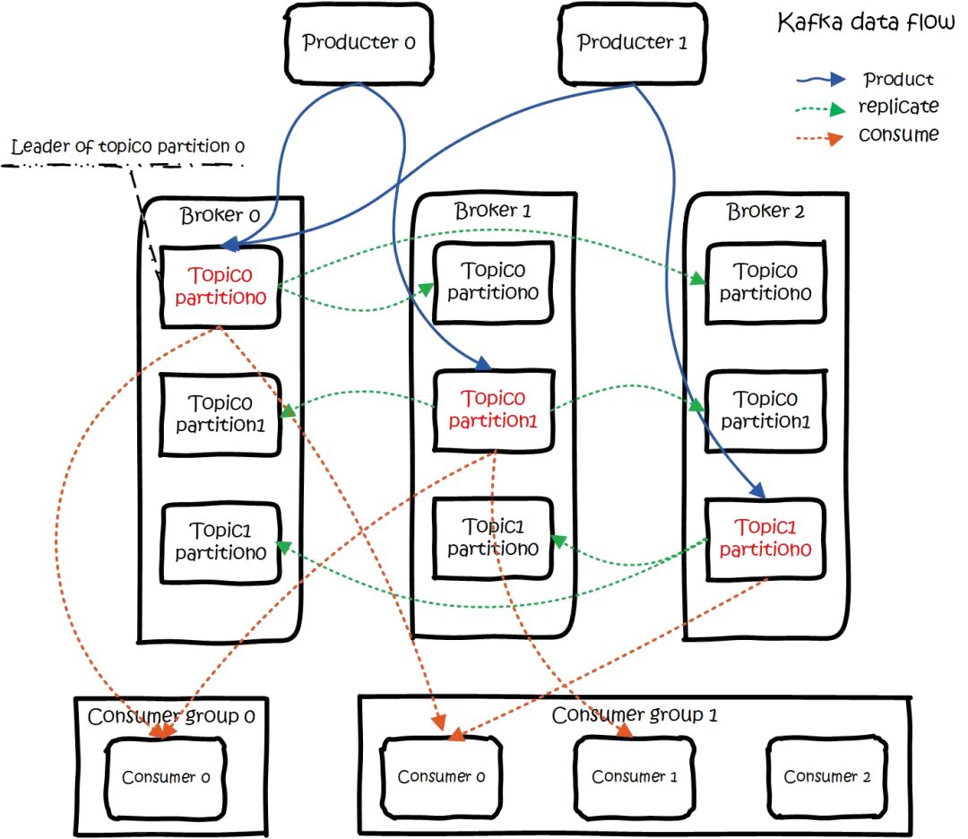 kafka data flow 大概用法就是,Producers往Brokers里面的指定Topic中写消息,Consumers从Brokers里面拉去指定Topic的消息,然后进行业务处理。图中有两个topic,topic 0有两个partition,topic 1有一个partition,三副本备份。可以看到consumer gourp 1中的consumer 2没有分到partition处理,这是有可能出现的,下面会讲到。