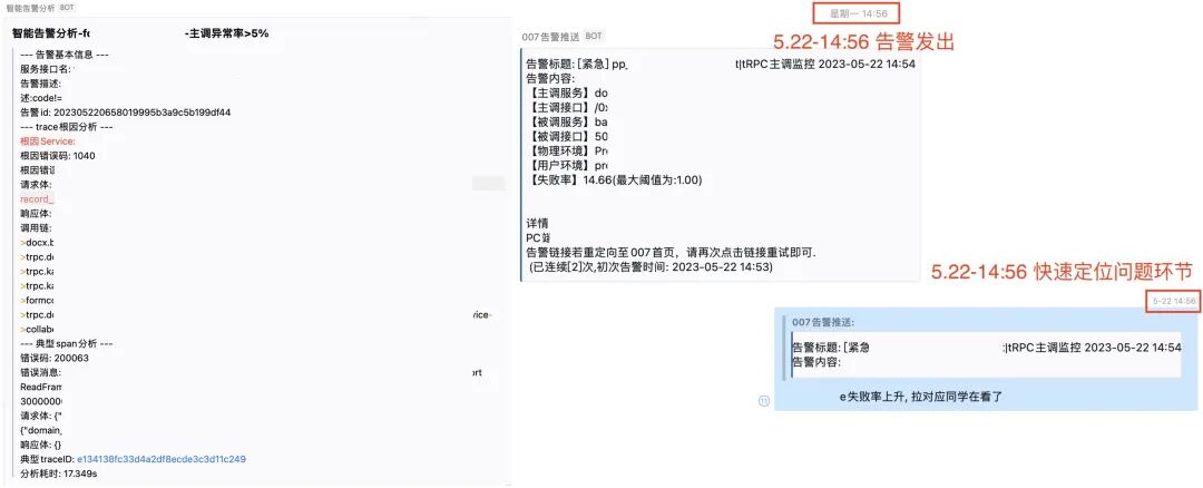 从收到故障发生告警 —> 定位问题所处环节 —> 同步相关责任同学,一共耗时在 1min 内,相比之前可观测性数据排查需由告警—>监控—>具体 Trace—>关联日志,链路较长导致定位问题耗时较长;智能告警可以将可观测性数据上下文打通,把相关信息直观呈现给开发同学,更快速高效定位问题,以更短的 MTTR 恢复用户体验。