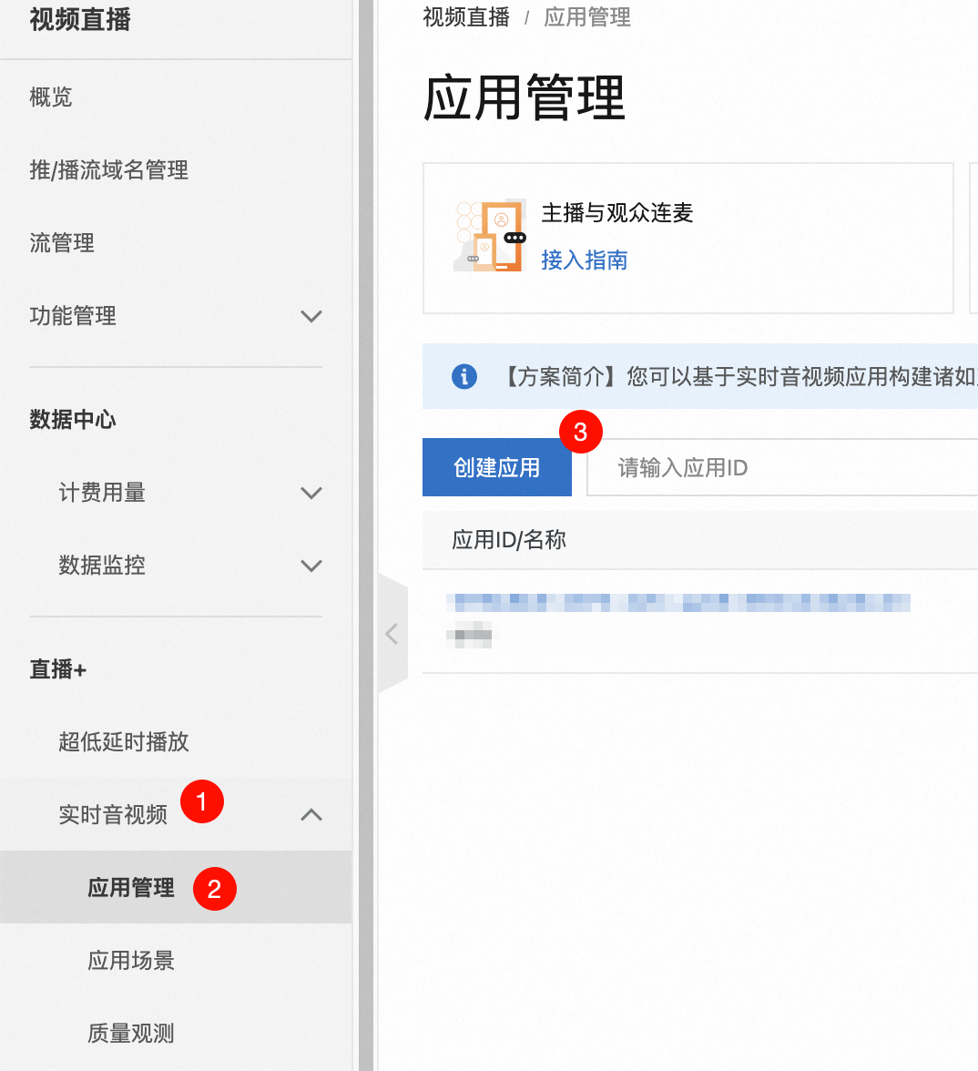 2.在视频云直播控制台:https://live.console.aliyun.com/overview,左侧导航栏单击直播+ > 实时音视频 > 应用管理。