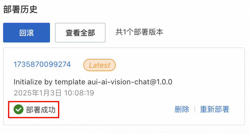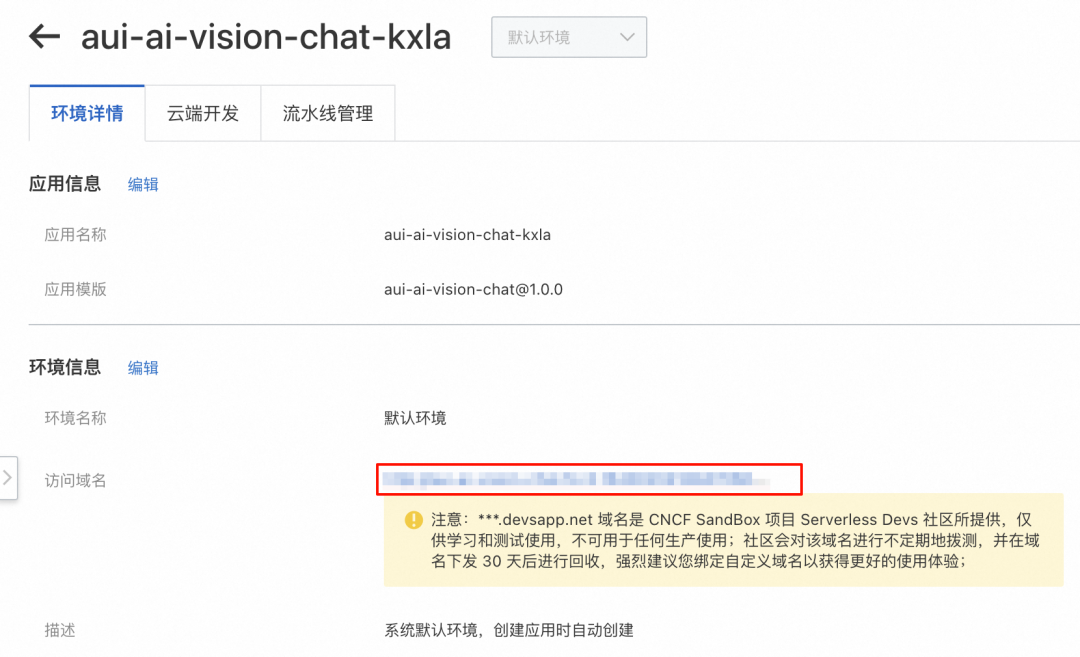 3.应用部署完成后,可以在应用的环境详情中找到示例网站的访问域名,点击即可查看,确认示例网站已经部署成功。