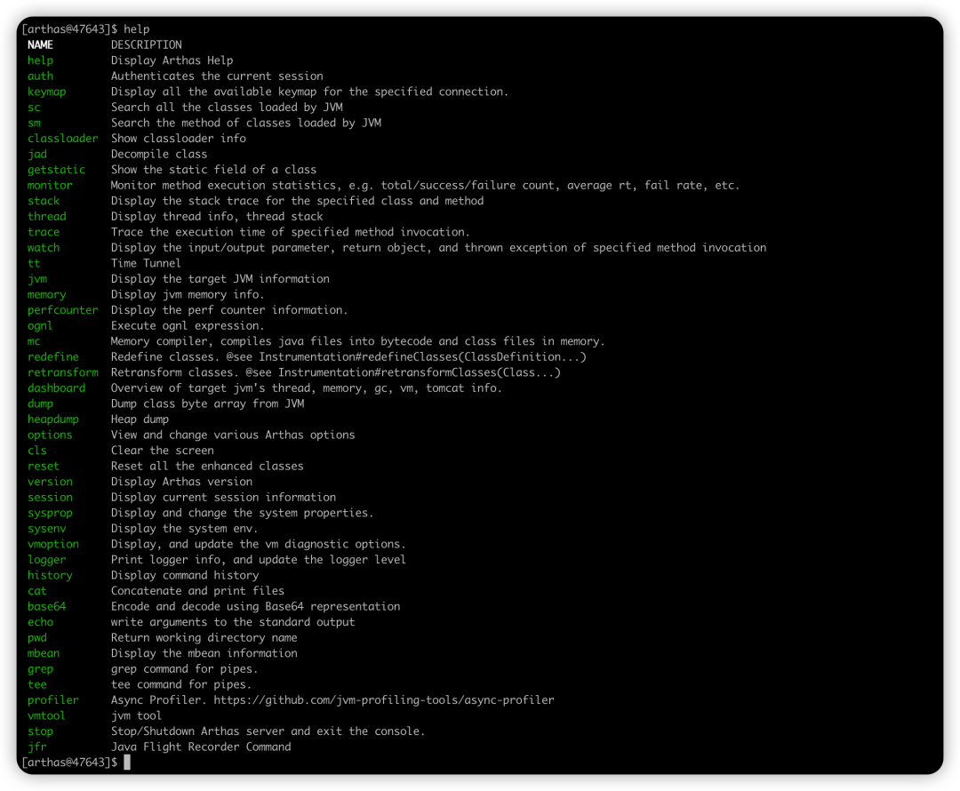 | | | | | --- | --- | --- | | 指令 | 说明 | 性能分析及问题排查的场景 | | classloader | 查看当前JVM下ClassLoader的列表及加载的实例统计信息 | * 常见于排查Metaspace空间利用率问题,常见的场景是由于Groovy脚本导致的Metaspace增加,进而导致应用FGC的问题排查 | | jad | 反编译 | * 常见于黑盒分析,无法快速活的源码的情况下分析程序内部逻辑的场景 | | getstatic | 获取静态字段的值 | * 常见于分析开关、配置、部分数据的情况,在分析性能数据时可以辅助排查 | | stack | 从当前方法点打印堆栈 | * 常见于分析热点方法调用来源,结合条件过滤,可以快速定位到异常数据产生的来源以及调用频率 | | trace | 从当前方法下钻 | * 常见于分析耗时情况,分析某一个方法耗时的原因。比如分析鹰眼某一个接口耗时很高的原因 | | watch | 查看方法调用的参数及返回值 | * 分析线上方法的入参及返回值,结合条件判断,可以快速知道某一个函数可能走到的场景 | | options | Arthas的一些选项 | * 在需要分析jdk内部的调用时,可以打开某些选项 | | logger | 打印日志相关的信息 | * 分析日志冲突,临时关闭某些日志场景等 | | profiler | 内部使用了Async Profiler工具,可以用来采集内存、cpu、锁、cache miss等火焰图数据 | * 性能分析,分析当前业务的热点方法