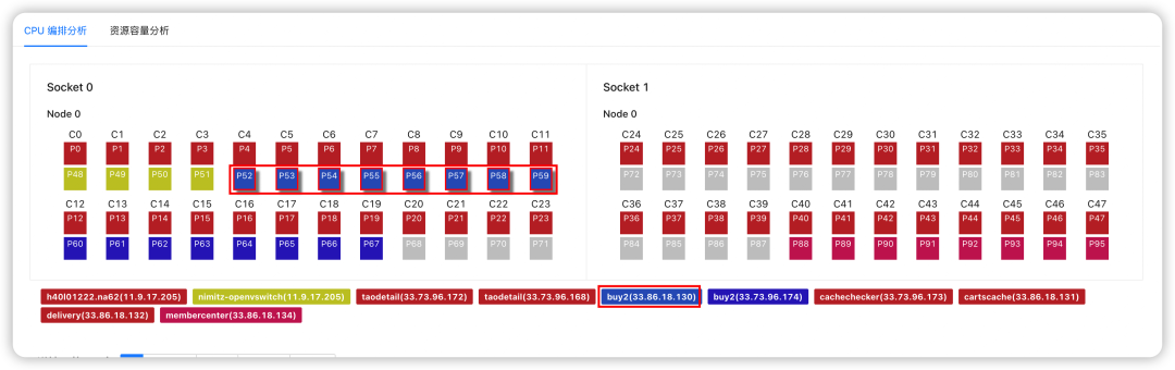 | | | | --- | --- | | 编排方式 | 说明 | | 8C16G容器,独占使用同一个Socket上的8个物理核(P4-P11 未编排容器) | 此时容器的性能表现最好,应用独占整个CPU | | 8C16G容器,独占使用跨Socket上的8个物理核(P20 - P28) | Socket可以简单对应到主板上的Cpu插槽,跨soeck后,会导致Cpu之间跨socket访问内存及cache,性能相比前一种场景要差,具体差异还和应用特性有关,大内存带宽的应用性能会相对更差 | | 8C16G容器,使用同一个Socket上的8个超线程,物理核对端被其他应用占用 | 由于超线程之间会存在L1、L2cache的共享,两个超线程之间会存在资源争抢,此时性能也会受到影响 | | 8C16G容器,使用同一个socket上的4个物理核 | 此时应用的表现比较稳定,不会收到外部性能的差异产生影响。一般情况下性能表现最差,但比较确定 |